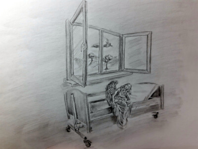 Občas za mnou chodí taká príjemná pani. Vraj tu pôsobí ako dobrovoľníčka. Podáva mi fľašku s vodou, rozpráva mi, ako je vonku. Vraj tu majú v liečebni aj sociálnu miestnosť a keď dlhšie usedím vo vozíku, pozvú ma tam. O spoločnosť sa okrem socioterapeutky stará aj drobná modrofialová andulka.