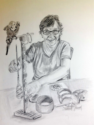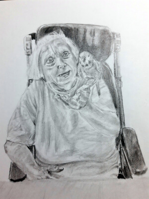 Sanitárky pripravujú Aničku do vozíčka a odvážam si ju do spoločenskej miestnosti. V náprsnom vrecku má aj okuliare, akoby vedela, že jej ponúknem činnosť. Za stolom aj s inými pacientami sa cíti rozveselene. Pohľadom koketuje s modrou andulkou, ktorá sa stala neoddeliteľnou súčasťou mojej práce v oblasti socioterapie.